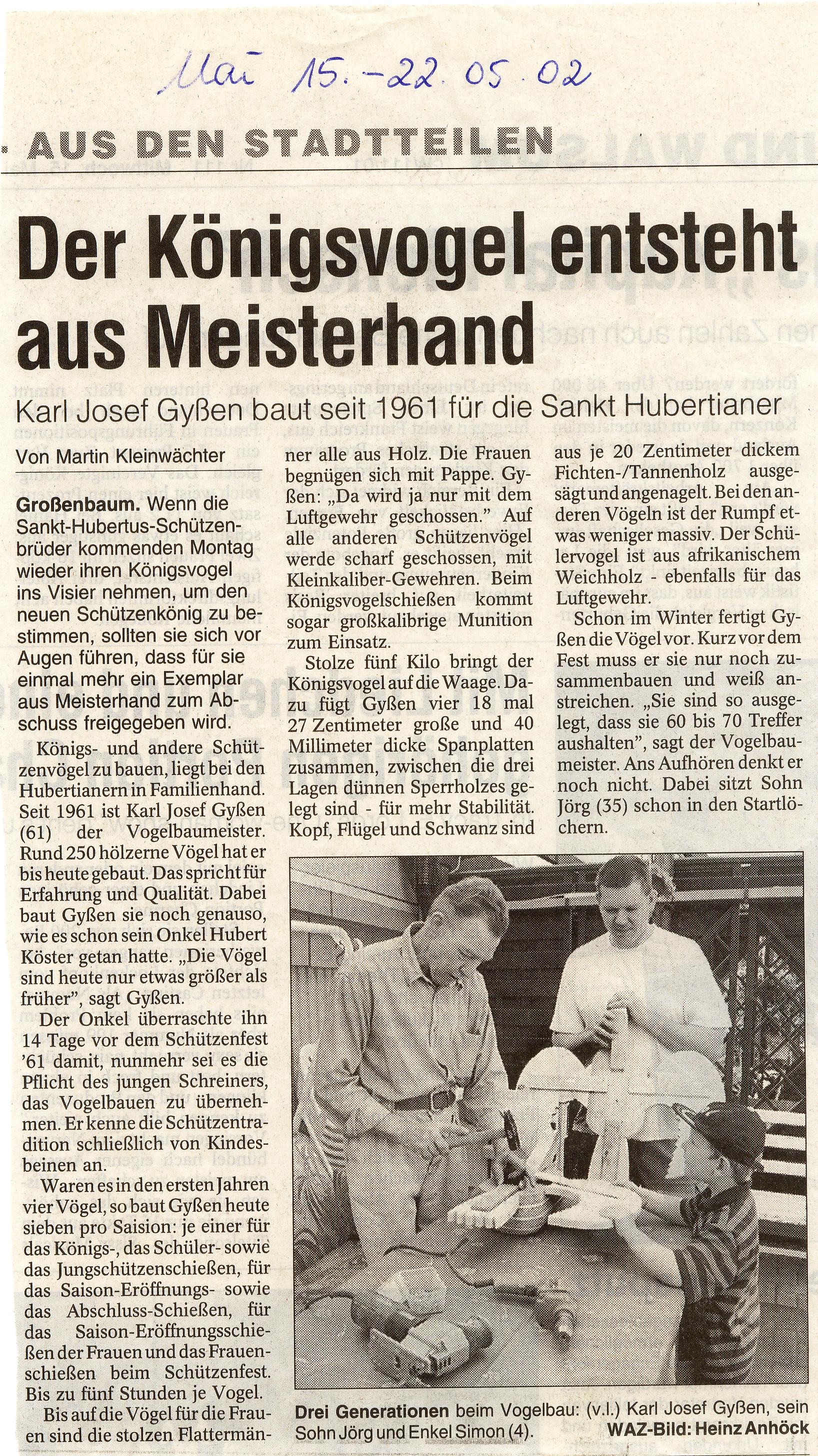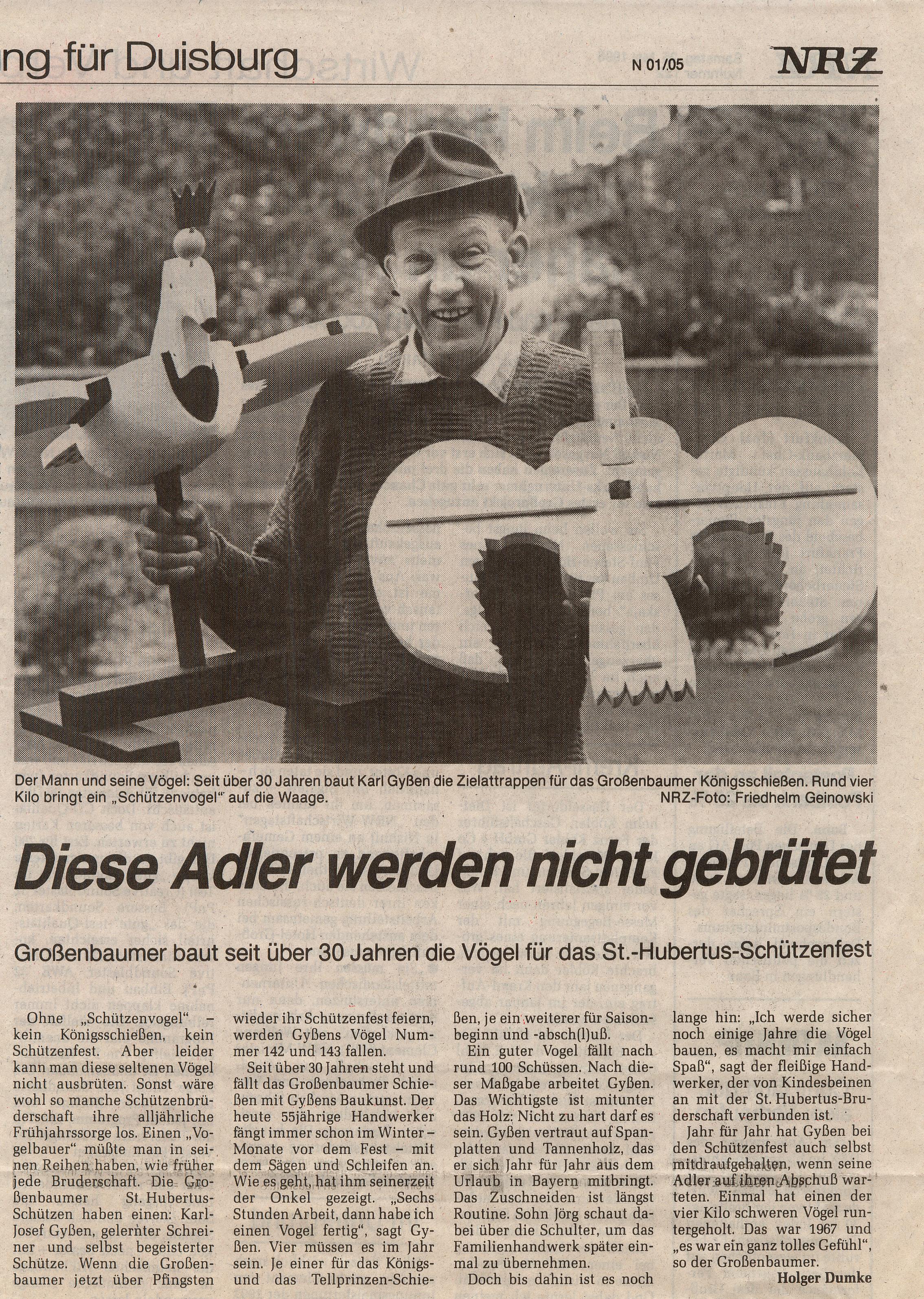 Ohne "Schützenvogel" - kein Königsschießen. Aber leider kann man diese seltenen Vögel nicht ausbrüten. Sonst wäre wohl so manche Schützenbruderschaft ihre alljährliche Frühjahrssorge los. Einen "Vogelbauer" müsste man in seinen Reihen haben, wie früher jede Bruderschaft. Die Großenbaumer St.Hubertus-Schützen haben einen: Karl-Josef Gyßen, gelernter Schreiner und selbst begeisterter Schütze. Wenn die Großenbaumer jetzt über Pfingsten wieder ihr Schützenfest feiern, werden Gyßens Vögel Nummer 142 und 143 fallen.